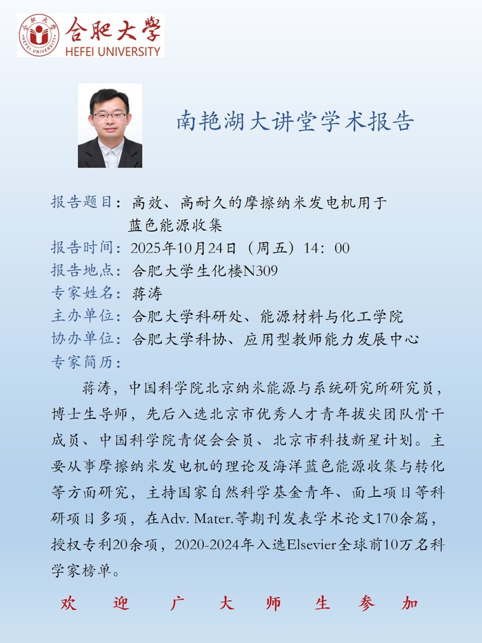 【南艳湖大讲堂】高效、高耐久的摩擦纳米发电机用于蓝色能源收集