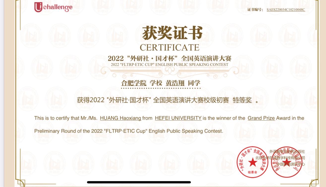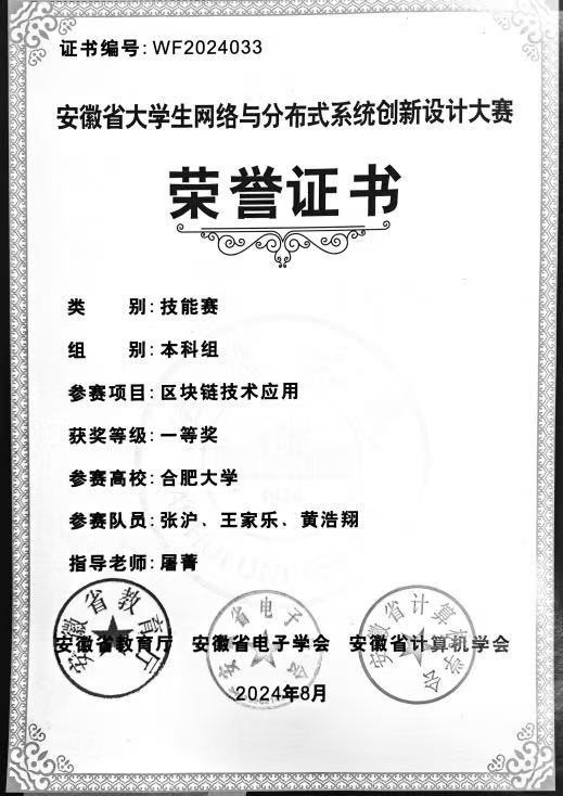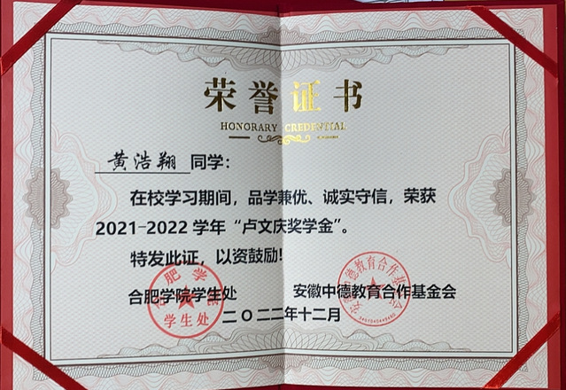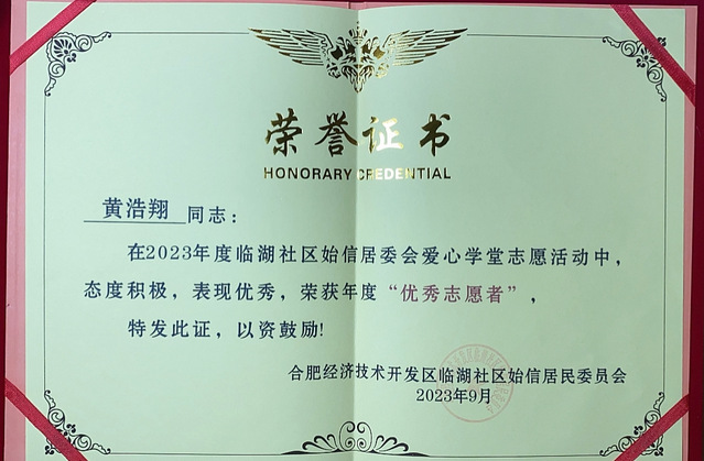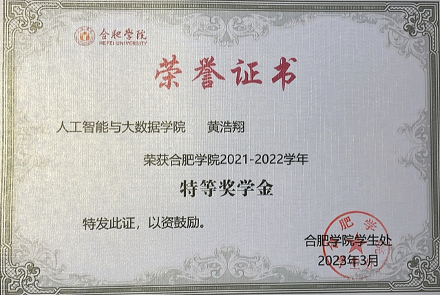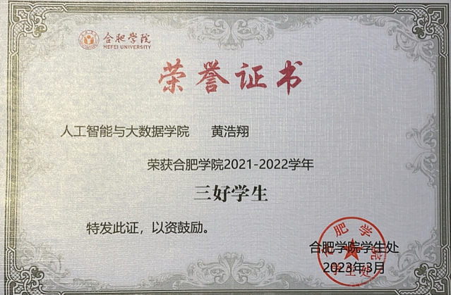 黄浩翔,男,汉族,2003年7月出生,中共党员,久久无码人妻一区二区三区午夜人工智能与大数据学院2021级软件工程专业毕业生,担任班级心理委员,目前已被澳大利亚蒙纳士大学录取为硕士研究生。连续三年学业成绩和综合测评成绩双第一,先后多次获得久久无码人妻一区二区三区午夜校级特等奖学金、卢文庆奖学金、罗顿奖学金等,多次获得三好学生、优秀学生干部、优秀团员等荣誉称号。曾获得外研社英语演讲大赛特等奖、安徽省大学生网络与分布式系统创新设计大赛一等奖、程序设计大赛三等奖等。参加合肥市自然科学基金项目-“分布式政务数据中心安全共享关键技术研究”一项,此外他德智体美劳全面发展,学习之余曾参加校运动会获得跳远、三级跳远第一名、一百米决赛第五名等体育竞赛奖项,获人工智能与大数据学院运动会通报表扬,同时还是校级文明寝室成员之一,积极参加校内外各项志愿服务活动,累计志愿服务时长70多个小时。