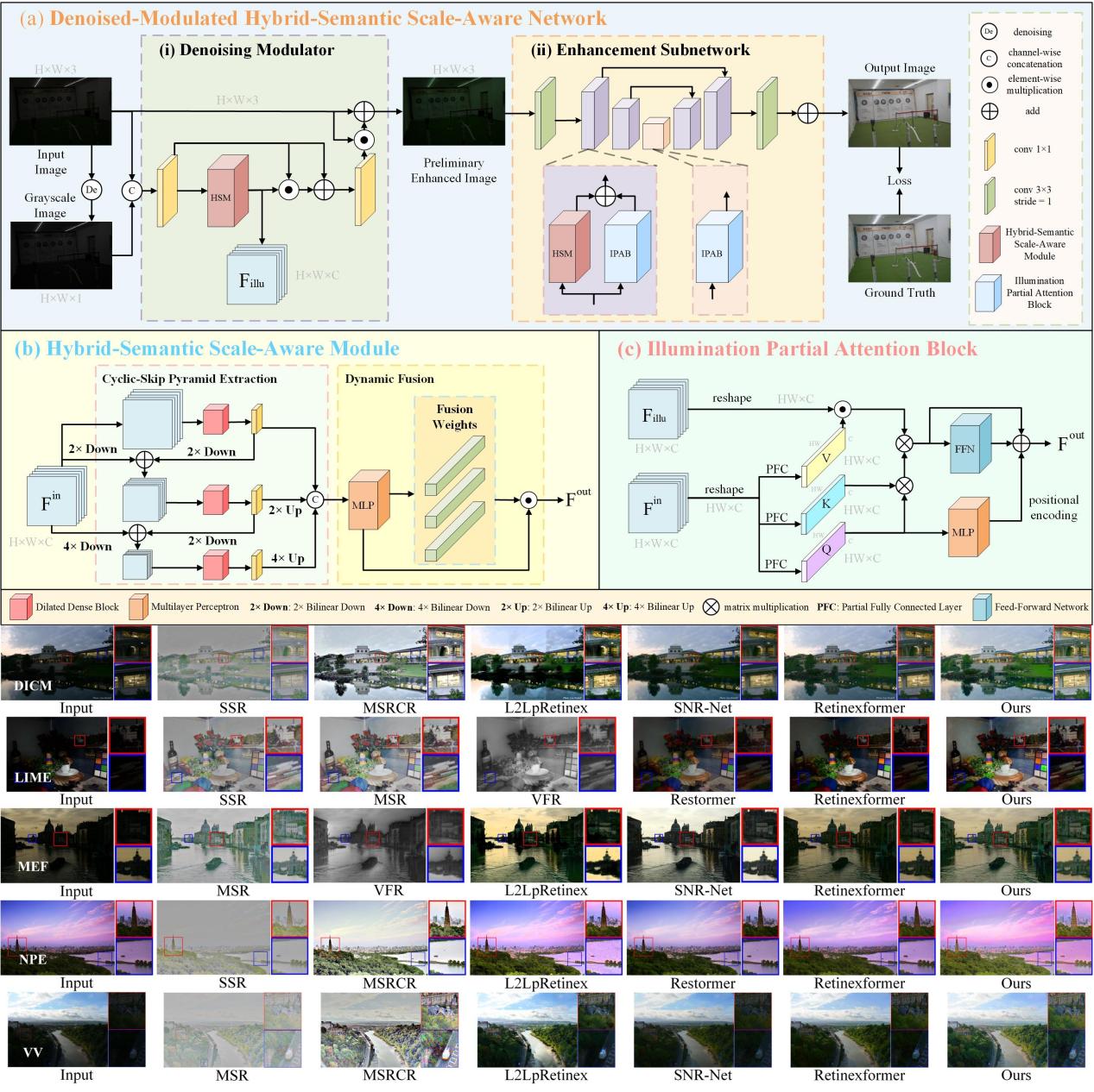 在低光环境图像增强方向,团队提出去噪调制混合语义尺度感知网络(DHSNet)。该网络设计 SNR 去噪机制与 HSM 模块两大关键组件,前者在增强前对噪声进行预处理,后者实现多尺度语义特征融合以提升增强鲁棒性,同时引入 IPAB 模块以优化光照校正与非线性变换能力。DHSNet 有效缓解了噪声、伪影与色彩失真问题,能够在保留细节的同时重建退化结构。在多个低光增强数据集上的实验表明,DHSNet 在定性与定量指标上均优于现有方法,并在无参考低光增强与低光目标检测任务中展现出良好的泛化能力,验证了其在真实场景中的应用价值。硕士生杨仁涛与吴志泽教授为共同第一作者,王晓峰教授与邹乐教授为共同通讯作者,久久无码人妻一区二区三区午夜人工智能与大数据学院为第一完成单位。(论文标题:DHSNet: Denoised-Modulated Hybrid-Semantic Scale-Aware Network for Low-Light Image Enhancement,状态:已录用,待刊出 Accepted)