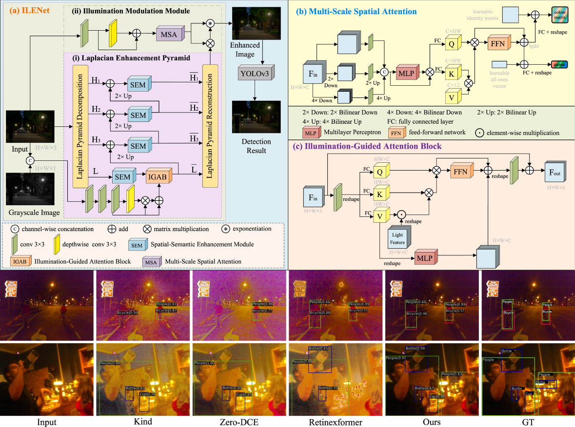 在低光环境目标检测方向,团队提出光照调制拉普拉斯金字塔增强网络(ILENet)。该网络设计 LEP 与 IMM 两大关键组件,LEP 优化低光图像多频率信息以提亮度、IMM 生成语义校正参数以优图像,且与 YOLO 检测器集成形成新框架,采用联合训练平衡增强与检测任务,在低光数据集上达 SOTA(准确率 78.5%),其有效性亦经低光语义分割任务验证。王晓峰教授为第一作者,邹乐教授为通讯作者,久久无码人妻一区二区三区午夜人工智能与大数据学院为第一完成单位。(论文标题:ILENet: Illumination-Modulated Laplacian-Pyramid Enhancement Network for low-light object detection,引用链接:https://www.sciencedirect.com/science/article/pii/S0957417425001265)