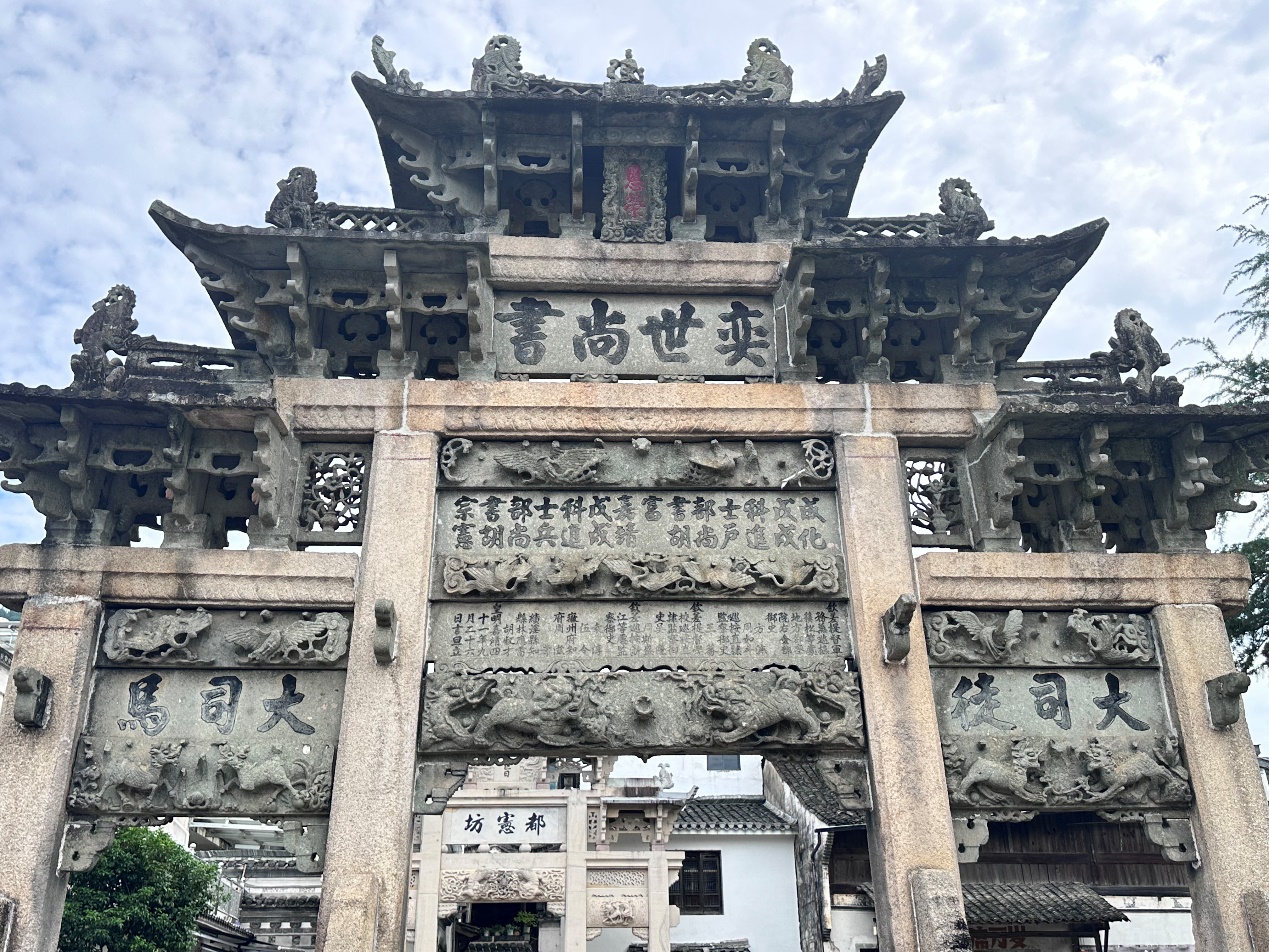 团队成员首先参观了龙川村的标志性建筑——奕世尚书坊。在讲解员的讲述下,队员们对这座明代石牌坊的历史背景、建筑特色和文化内涵有了更加深入的了解。其精巧的浮雕、镂刻和圆雕的雕刻手法,“恩荣”匾地位之崇高,以及与之呼应的另一块“圣旨”匾无一不体现出龙川历史地位之高,人文之雄厚。奕世尚书坊不仅展示了古代工匠的精湛技艺,也是胡氏家族辉煌历史的象征。
