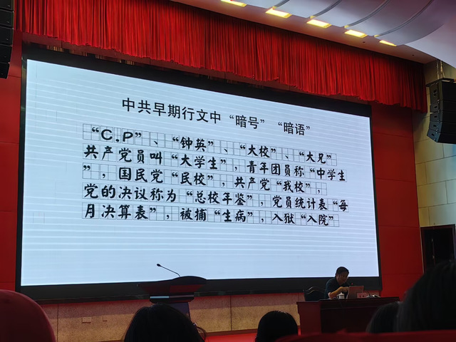 党课初始,贾峰老师回顾了中共一大转移阵地的历史。1921年7月,中共一大在上海法租界召开时突遭干扰,代表们在危急时刻转移至浙江嘉兴南湖继续会议。这一转移不仅是地点的变更,更是信仰在危机中的坚守。代表们临危不乱,为了实现党的创立这一伟大目标,在艰苦条件下完成会议,彰显了对马克思主义信仰的执着追求,为党的隐蔽斗争精神埋下了火种。随后,贾峰老师提到中共早期行文中的“暗号”“暗语”,如“C.P”“钟英”“大校”等,是地下工作者传递信息的关键。这些暗号不仅是简单的代码,更是同志们以命相托的信任纽带。它们体现了早期地下工作者的智慧,也反映出信仰在隐蔽战线上的深刻烙印,每一个暗号背后都是对党的忠诚与信仰的无声诠释。