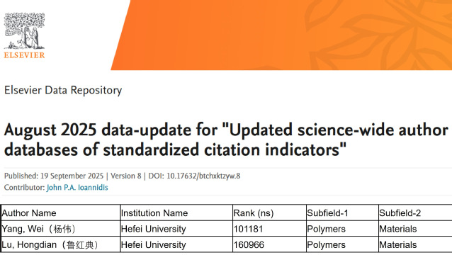 近日,斯坦福大学与国际权威学术出版社爱思唯尔联合发布2025年全球前2%顶尖科学家榜单。我院杨伟教授和鲁红典教授入选2025年全球前2%顶尖科学家“年度影响力”榜单。这是继2023年以来,两位教授连续第三年入选该榜单。此外,杨伟教授和鲁红典教授于2024年分别牵头获得安徽省自然科学二等奖和中国非金属矿科学技术二等奖(基础研究类),这充分体现出学院在高层次人才培养方面取得了长足进步。