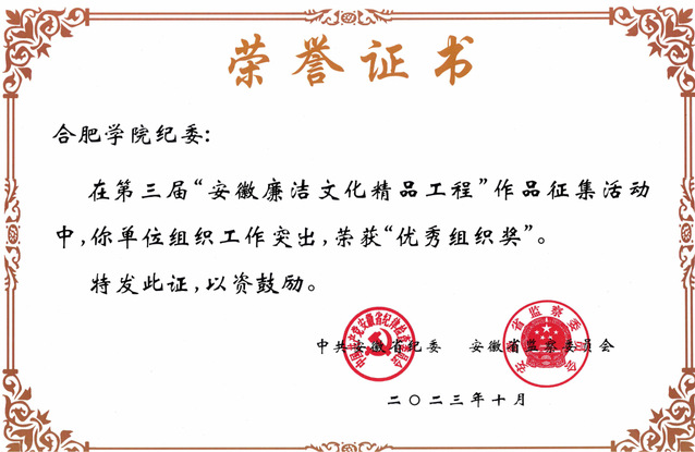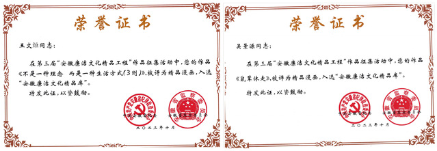 根据第三届“安徽廉洁文化精品工程”作品征集展播活动,校纪委第一时间发布了《关于合肥学院廉洁文化作品征集的通知》,得到了全校师生的积极响应。截至4月10日,共征集廉洁文化作品150余件,校纪委通过择优评选,评出一等奖6个、二等奖8个、三等奖20个、优秀组织奖6个,并对获奖作品在合肥学院纪检监察网进行了线上展播。根据要求,校纪委择优推选了6件优秀作品参加第三届“安徽廉洁文化精品工程”作品征集展播活动,最终我校设计学院的王文烜、吴景源两位同学创作的漫画作品成功入选。
