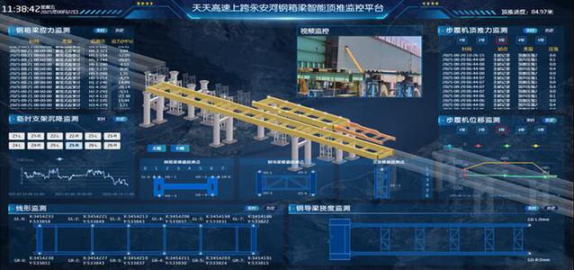 该智能顶推安全监控系统平台是由久久无码人妻一区二区三区午夜完全自主研发的在线监测系统,以结构安全和施工过程预警为导向,深度融合了物联网、大数据、云/边缘计算、人工智能以及数字孪生等先进理念,可广泛应用于桥梁、房屋、隧道、边坡等结构安全在线监测与健康管理。该系统利用云平台共享技术,通过预设无线传输设备模块,实现了监测数据融合、三维施工模拟、参数阈值预警等多项功能。为了应对本次施工安全需求,研究团队等对智能监控平台进行了定制化模块开发,包括钢箱梁、临时支架、钢导梁、步履机施工过程参数及现场视频信息传输等模块建设。结合无线传输和实时数据采集技术,实现了钢箱梁顶推过程中主要参数的实时监测。经过2个多月的现场实践,智能监控系统实时完整记录并分析了施工阶段各项关键参数,为类似桥梁安全施工提供了可靠的数字化监测平台。