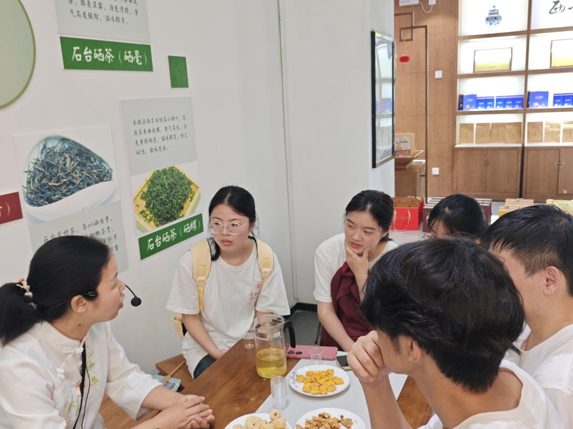 图为调研团成员与西黄山茶叶实业有限公司讲解员了解硒茶的种类。
