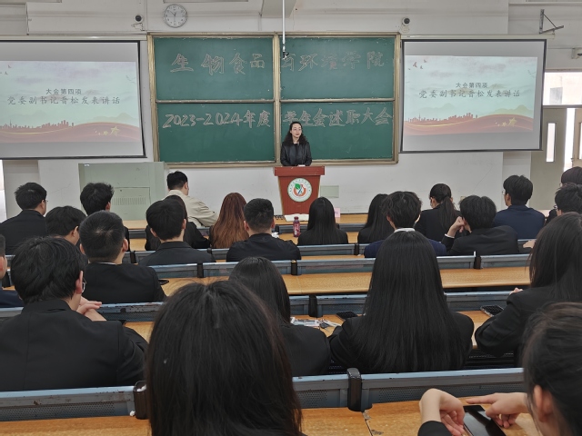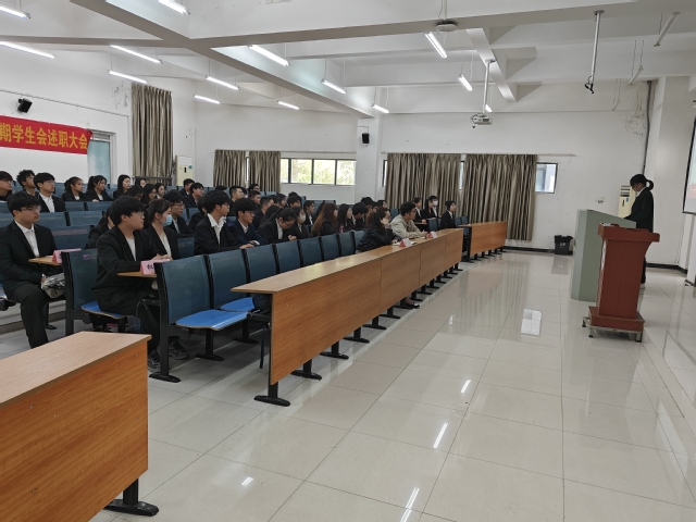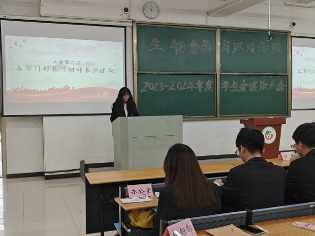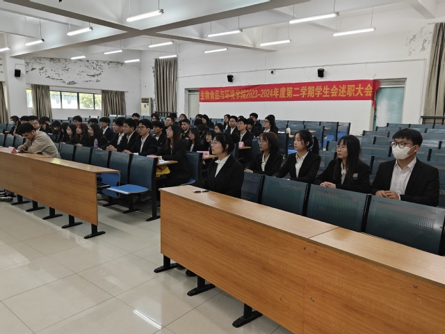 4月10日中午十二点半,生物食品与环境学院2023--2024学年第二学期学生会述职大会于生化楼一阶梯准时举行。出席本次会议的有党委副书记晋松、团委负责人杨林、团委学生会主席团成员、各部门部长以及委员。本次会议由主席团乐雯轩主持。
