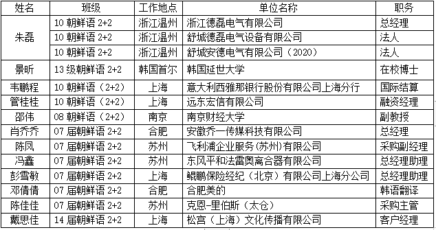 朝鲜语专业毕业生就业率高,朝鲜语专业毕业生由于具备优秀的韩语能力和国际化教育的背景,被国内具备韩资背景用人单位青睐,多人服务于上海国际远东金融公司、韩国友利银行上海分公司、人民日报驻韩国编辑部、意大利西亚纳银行上海分行、浙江德里电器公司、合肥长鑫、合肥学院等各类企事业单位。
