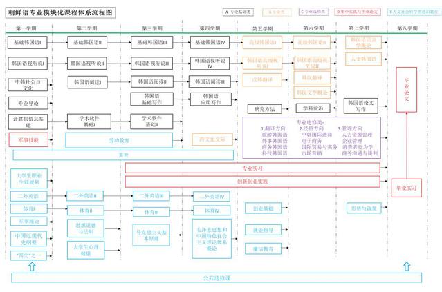 1. 韩语专业技能模块:专业导论(韩)、基础韩语、高级韩语、韩语视听说、韩语阅读、基础韩语写作、应用韩语写作、韩汉互译、托业英语