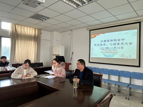 2023年11月30日中午12:00,外国语学院在三楼会议室召开了思政委员、心理委员大会。本次会议出席的老师有外国语学院党委书记吴孔宝,团委老师张正华与王雨濛。大会旨在加强学院学生思政教育和心理健康教育。