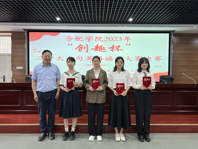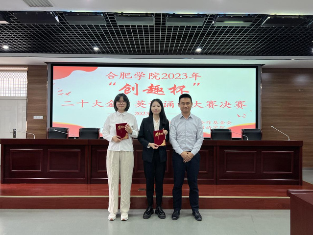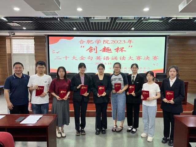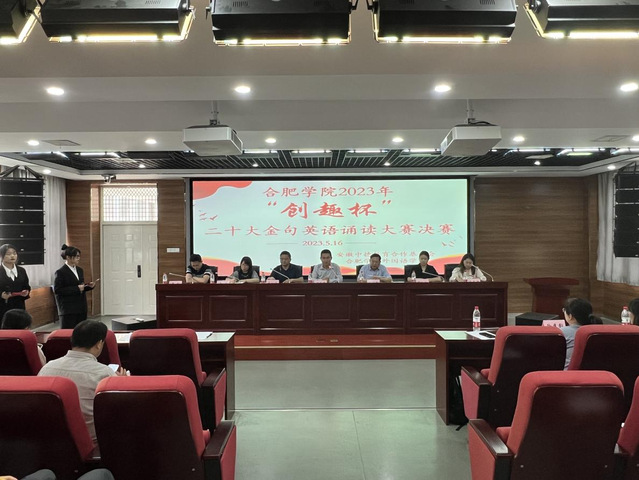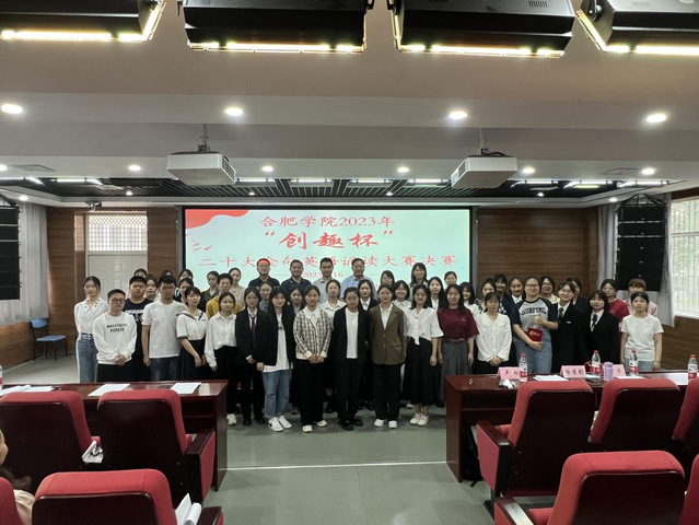为深入学习贯彻党的二十大精神,引领学生用习近平新时代中国特色社会主义思想武装头脑,5月16日下午,2023年“创趣杯”党的二十大报告金句英语诵读大赛在我校一期6栋学术报告厅举行。合肥创趣电子科技有限公司董事长方成俊一行,安徽中德教育合作基金会秘书长何世昆,外国语学院党委副书记、纪委书记吴孔宝,外国语学院副院长李洁,外国语学院党委委员、英语系主任卢杨出席比赛。