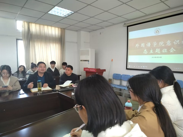 3月14日中午,外国语学院组织学生骨干召开意识形态工作专题会议,院党委副书记吴孔宝和22个班级的66名班长、团支书、思政委员参加会议,院学工办主任李发俊主持会议。